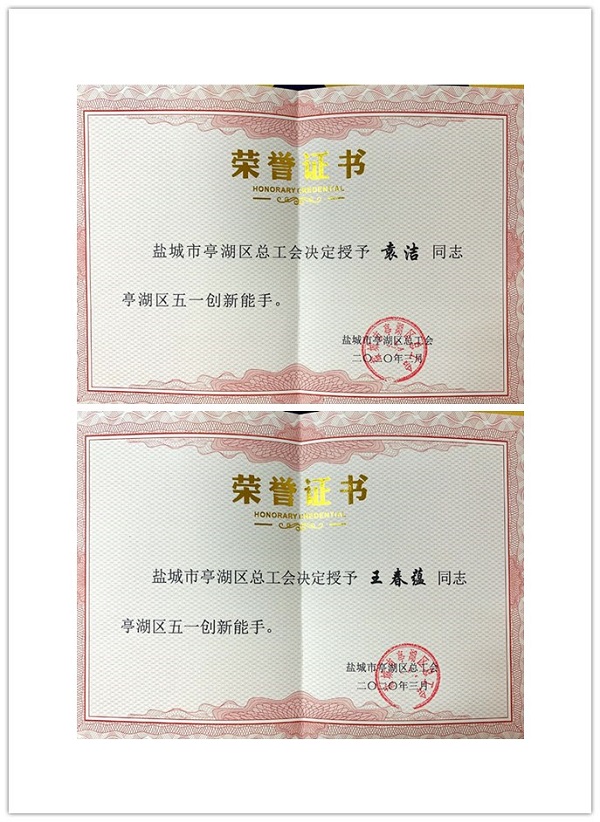 近日,盐城市亭湖区总工会下发《关于授予2019年度全区职工职业技能竞赛先进个人亭湖区五一劳动奖章的通知》(亭工发[2020]5号),集团“90后”青年员工袁洁、王春蕴双双荣获“亭湖区五一创新能手”称号,这再次向社会各界充分展示了仁禾中衡人的综合实力及品牌形象。