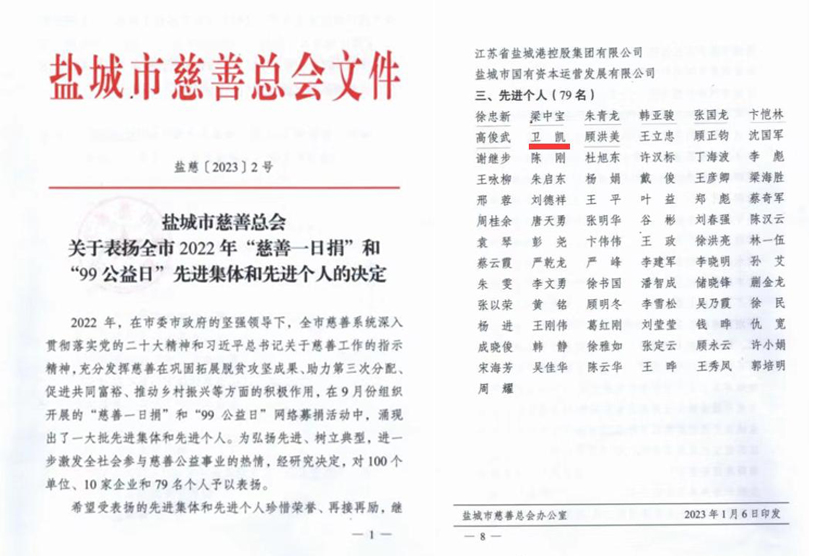 近日,盐城市慈善总会下发《关于表扬全市2022年“慈善一日捐”和“99公益日”先进集体和先进个人的决定》(盐慈[2023]2号文),集团总经理卫凯荣获全市2022年“慈善一日捐”和“99公益日”先进个人。