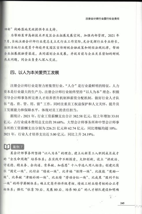 “以人为本关爱员工发展”章节阐述了注册会计师行业是智力密集型行业,“人合”是行业最鲜明的特征,人力资本是行业最大的生产力。注册会计师行业始终坚持“以人为本”理念,积极引导会计师事务所完善人才培养晋升机制和薪酬机制,做好行业人才队伍“选、育、管、用、留”工作,同时注重员工权益保护和人文关怀,提升员工发展能力和保障水平,体现对员工的责任担当。附后的案例7、8、9是集团30多年发展的人才培养体制机制中典型的“十八字”选人用人标准、“七比”薪酬体系、员工“四晋升”通道、“传帮带”辅导制度、设立“人才基金”等做法。
