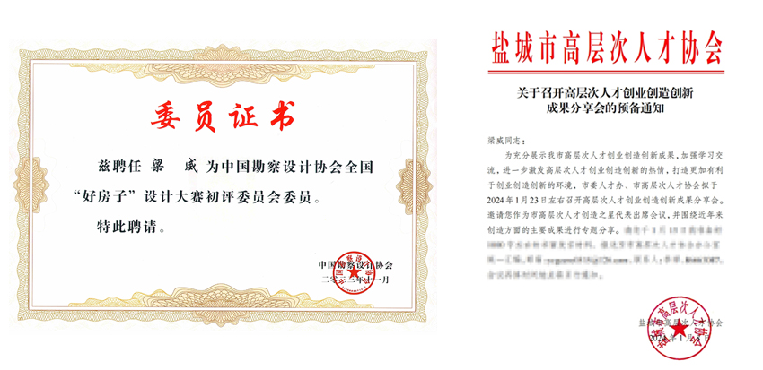 近日,集团梁威同志喜获两项荣誉,分别为入选中国勘察设计协会主办的全国“好房子”设计大赛初评委员会委员,荣获盐城市高层次人才协会授予的2023年度十佳会员“创造之星”荣誉称号。