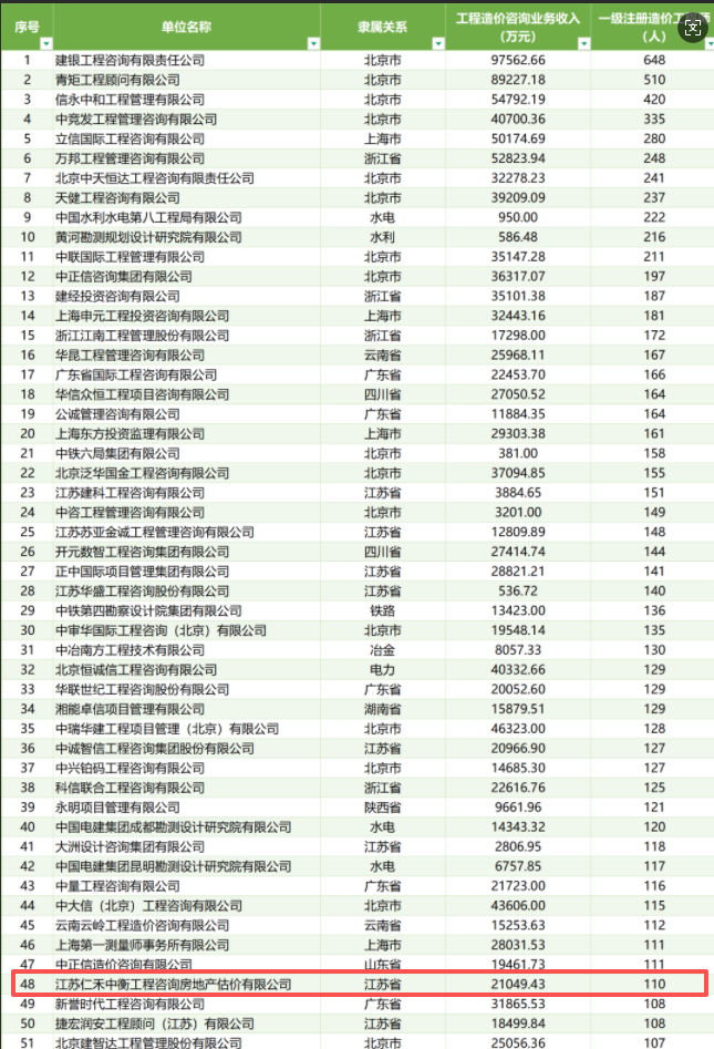 2024年全国工程造价咨询企业一级注册造价工程师人数排名前一百