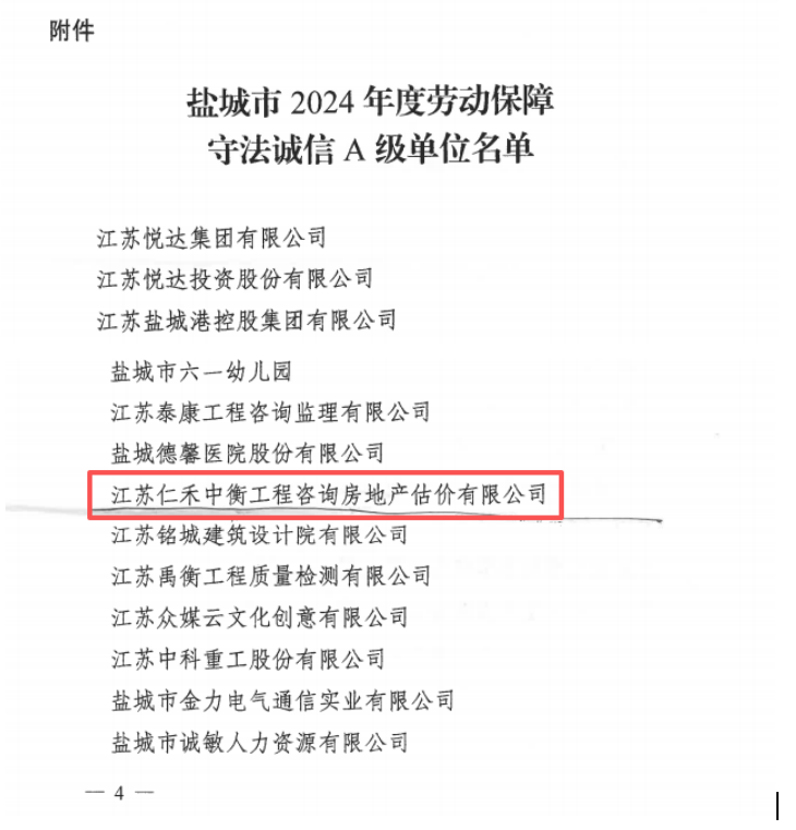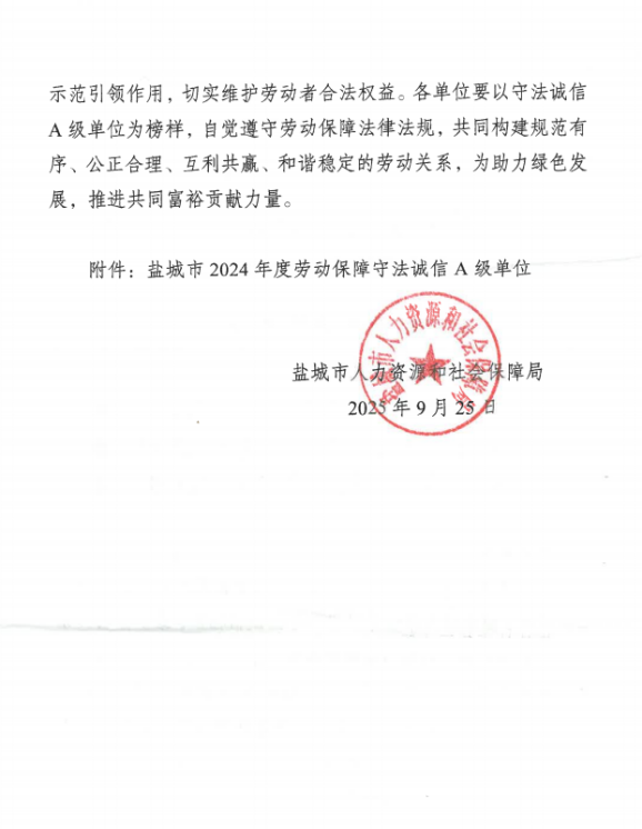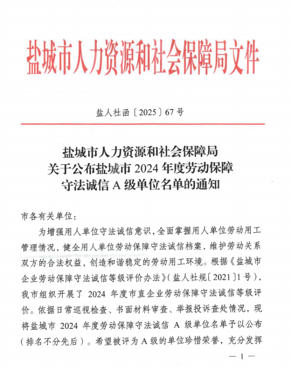 近日,盐城市人力资源和社会保障局下发《关于公布盐城市2024年度劳动保障守法诚信A级单位名单的通知》(盐人社函〔2025〕67号)文,集团工程公司榜上有名,这是自2023年度获得“A级单位”后第二次获评“盐城市2024年度劳动保障守法诚信A级”。