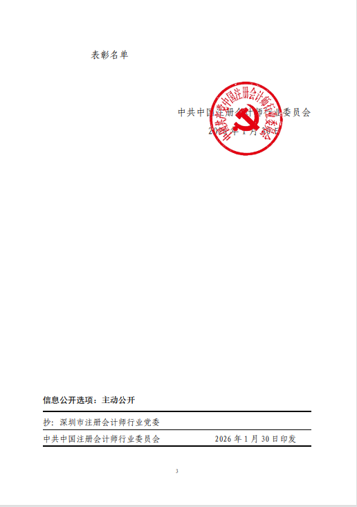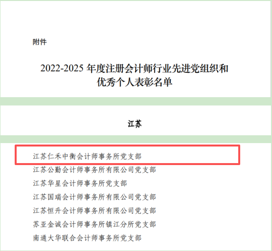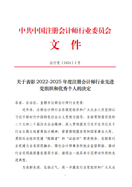 1月30日,中共中国注册会计师行业委员会下发《关于表彰 2022-2025 年度注册会计师行业先进 党组织和优秀个人的决定》(会行党〔2026〕2 号)文,集团仁禾中衡会所党支部荣获“2022-2025 年度注册会计师行业先进党组织”荣誉称号,至此共四次获中共中央组织部和中注协行业党委表彰,这是各级党组织对集团党建工作的高度肯定,也是对仁禾中衡会所党支部全体党员干部职工创新实干、奋勇争先的极大褒奖和鼓舞。